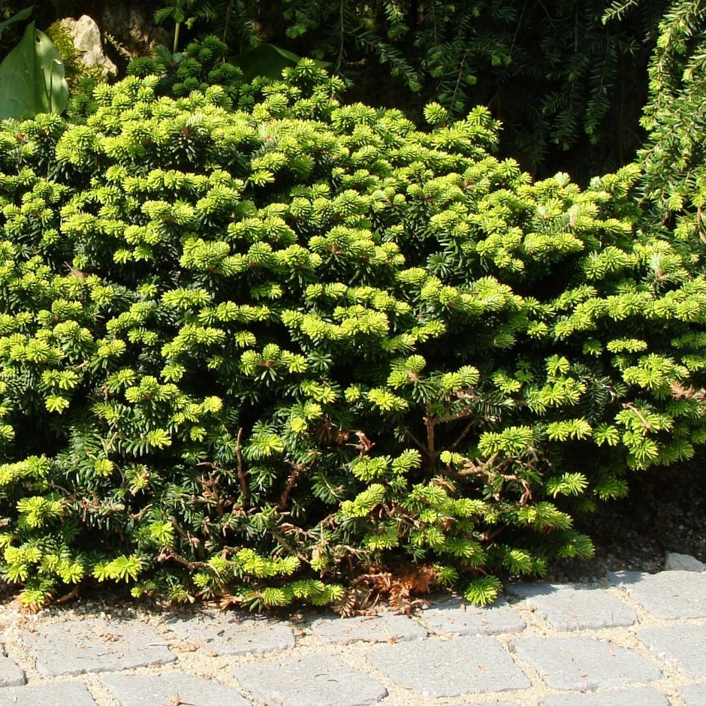 La forme ‘Nana’ reprĂ©sente en quelque sorte une miniature de cette espèce. Il ne dĂ©passera pas 50 cm de hauteur pour 65 cm de diamètre, au bout de nombreuses annĂ©es de culture. Il prĂ©sente un port compact, d’abord globuleux, puis plus Ă©talĂ©, et forme un gros coussin très doux, constituĂ© par des rameaux Ă©rigĂ©s oĂą s’implantent comme sur un goupillon des aiguilles très fines et très souples, vert franc sur le dessus, marquĂ©es de 2 lignes blanches sur le dessous. Ses gros bourgeons printaniers couronnent son feuillage vert sombre d’un velours vert tilleul. A noter que cette variĂ©tĂ©, comme l’espèce type, est imprĂ©gnĂ©e d’une rĂ©sine odorante (un baume) exhalant un parfum Ă©picĂ© très agrĂ©able.