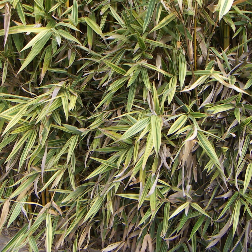 Le cultivar Shiroshima, introduit en Europe dans les années 1970, a été sélectionné pour son feuillage panaché et son développement plus réduit. La plante affiche un port à la fois dressé et très buissonnant. Sa croissance est assez rapide, il développe à partir de ses rhizomes des cannes solides et rectilignes que l’on appelle des chaumes. Elles mesurent environ 1 à 2 cm de diamètre, et peuvent atteindre 2 à 3 m de hauteur selon les conditions de culture, une plante cultivée en pot se développera moins qu’en pleine terre. Ces cannes sont lisses, cannelées, de couleur verte, parfois légèrement striées de blanc-crème. Les gaines qui recouvrent les jeunes tiges sont brunes et caduques. Le feuillage est abondant, très persistant: il reste éclatant même lorsque l’hiver est froid et sec. Chez ce bambou, les feuilles sont deux fois plus longues et plus larges sur les chaumes de l’année que sur ceux de l’année précédente. Les feuilles panachées sont effilées à leur extrémité, longues de 15 à 20 cm et larges de 4 à 5 cm, légèrement retombantes. Particulièrement panachées en hiver, elles s’ornent au printemps d’un liseré rose du plus bel effet.