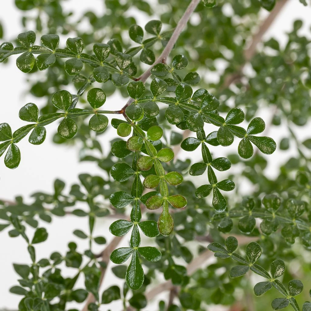 Il émet de courts rameaux, qui poussent en zigzag, avec une couronne tantôt conique, tantôt plus étalée, de façon assez irrégulière et non symétrique. Les feuilles sont composées, imparipennées, formées habituellement de 5 ou 7 paires de folioles latérales et d’une foliole terminale. Ne mesurant que 3 à 6 cm de long, ces feuilles de couleur vert foncé sont brillantes et d’un vert plus clair à la face inférieure. Leur faible surface ainsi que la cuticule protectrice qui leur donne cet aspect luisant sont comme le caudex des adaptations à la sécheresse. La transpiration de la plante est ainsi réduite au minimum.