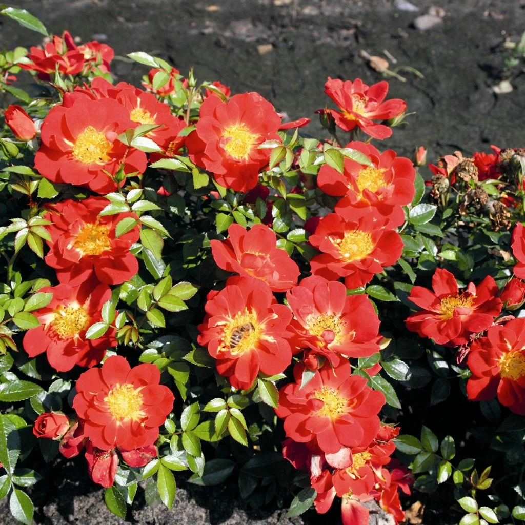 Les fleurs du Rosier ‘Bee’s Paradise Light Red’, réunies en petits bouquets terminaux, lui viennent du rosier polyantha, un ancien hybride issu du Rosa multiflora et du R. chinensis. Elles sont particulièrement riches en nectar et en pollen. Bien ramifié, il forme un buisson très touffu d’environ 50 cm de hauteur pour 60 cm de largeur. Les fleurs en coupes semi-doubles, de 2 à 4 cm de diamètre, sont composées de 5 à 10 pétales rouges. Elles s’épanouissent en dévoilant leur cœur rempli d’étamines jaune d’or. La floraison commence en juin et se renouvelle par vagues successives jusqu’en octobre. Chez les rosiers Bee’s Paradise, les fleurs fanées tombent toutes seules, sans qu’il soit nécessaire de les tailler. Naturellement, elle marquera le pas si le sol est trop sec en été, pour reprendre en septembre. Cette variété développe un feuillage d’un vert assez foncé, lustré, caduc, qui tombe en automne. Sa résistance aux maladies des rosiers est très bonne.