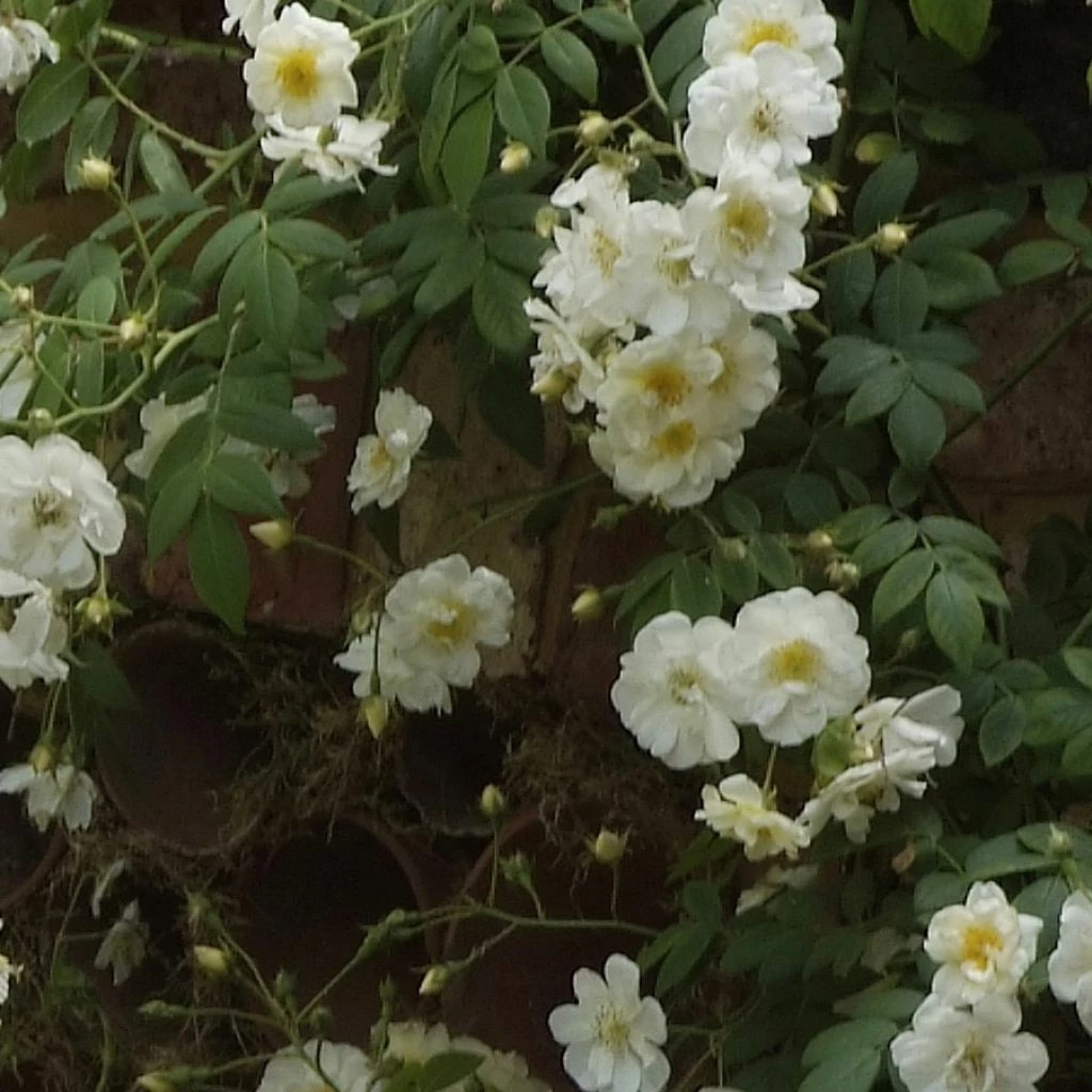 Ce grand rosier obtenu par Sander et Fils en 1912, sélectionné à l’époque parmi environ 4000 semis, il demeure encore aujourd’hui une référence parmi les rosiers lianes. Il atteindra facilement 6m de hauteur pour une envergure de 4 m. Ses longues tiges sont souples et gracieuses, entièrement couvertes d’un feuillage très sain, vert foncé et brillant, contrastant merveilleusement avec la floraison d’un blanc pur. Les fleurs de cette liane se forment en juillet, puis plus sporadiquement en septembre. Elles naissent sur sur de courtes pousses de la 2ème année, en boutons blanc pur. Elles s’épanouissent en rosettes d’un blanc neigeux, doubles, comptant plus de 40 pétales, et mesurant 3 cm de diamètre. Elles sont rassemblées en grappes très denses tout le long des tiges flexibles. Légère malgré son abondance, sa floraison exubérante recouvre dès la première année de culture le support mis à sa disposition. Les petits fruits qui font le régal des oiseaux à la mauvaise saison sont en réalité des faux fruit charnus appelés cynorrhodons. Ils renferment une grande quantité d’akènes à une seule graine.